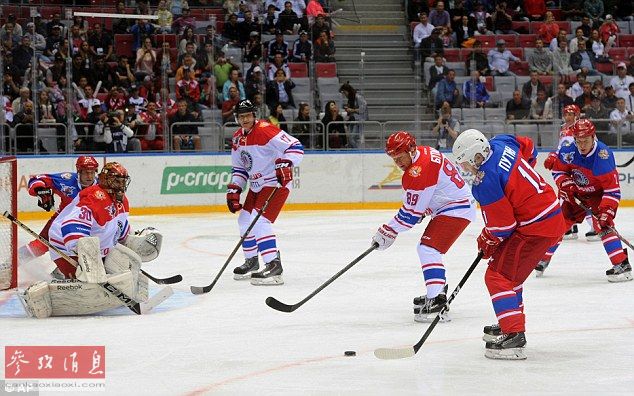 普京在冰球比赛中摔倒 瞬间脸红(图)