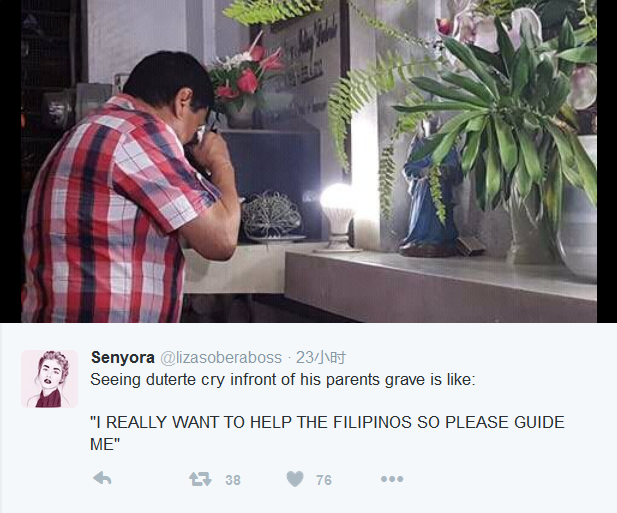 菲律宾新当选总统杜特尔特(Rodrigo Duterte)于5月11日凌晨得知自己胜选后,立即赶到父母的灵位前报喜。期间情绪失控,在父母坟前流泪。