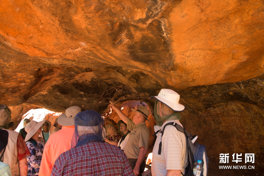 图为澳大利亚乌鲁鲁-卡塔丘塔国家公园内,导游向游客介绍土著人的岩画。该公园位于澳大利亚中部,是联合国教科文组织认定的文化自然双遗产地。新华网发(钱军摄)