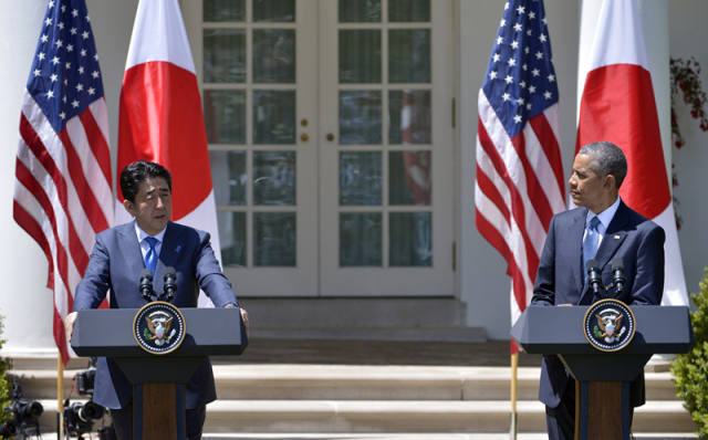 2015年4月28日,美国总统奥巴马和到访的日本首相安倍晋三出席在华盛顿白宫举行的联合记者会。新华社记者殷博古摄
