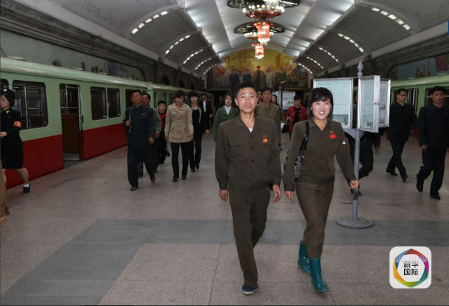 5月7日,在朝鲜平壤,乘客在地铁内乘车。当日是朝鲜劳动党第七次全国代表大会召开的第二天。朝方安排外国媒体采访平壤地铁。 (新华社记者郭一娜摄)