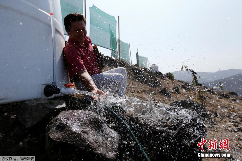 当地时间5月11日,秘鲁利马郊区附近的山坡上,一批“没有水的秘鲁人”社团领导人建设的许多网子,用以从潮湿的雾中获取水分。图为人们使用从雾中收集的水源。