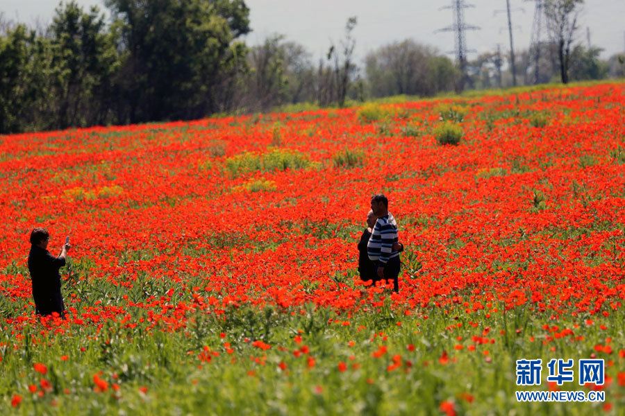 5月11日,哈萨克斯坦南部城市阿拉木图郊外大量野生的罂粟花绽放,火红的罂粟花和阿拉套山的雪景相互衬托,形成一道美丽的风景。大片鲜艳的罂粟花吸引当地民众前往观赏。 新华网记者周良摄