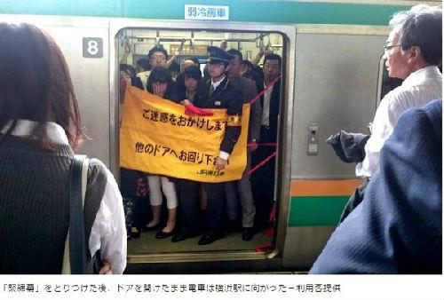 日本JR横须贺线一班电车5月11日上午尖峰时间,车厢门突然故障无法关闭,站务人员只好拿出一面长0.8米、宽1.2米的塑胶布应急,暂时挂在门口充当车门,并派人随车以确保安全,让列车能够继续行驶。