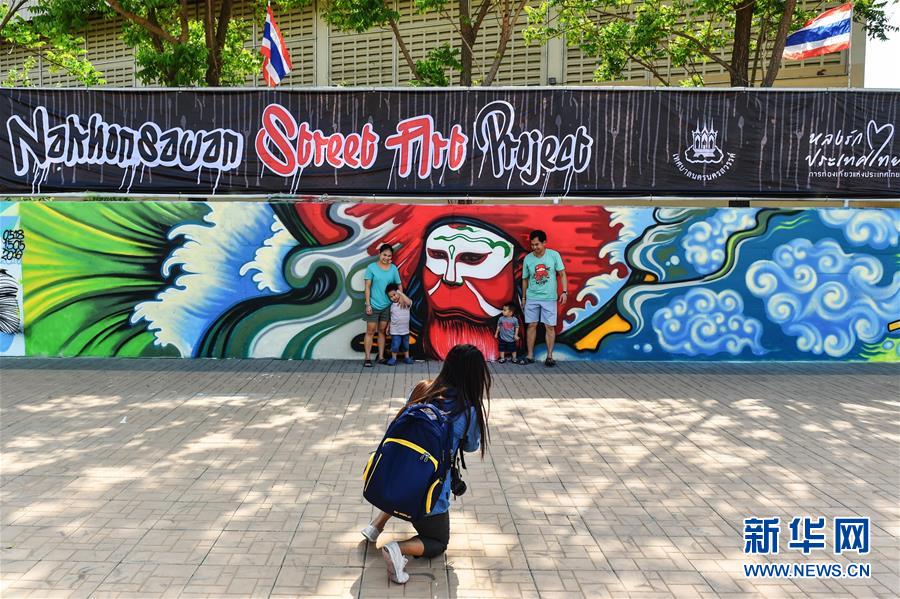5月15日,在泰国中部的那空沙旺,市民与涂鸦画作合影。