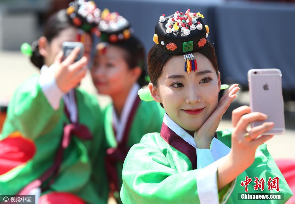 韩国举办传统成年礼 美少女穿韩服忙自拍(组图)