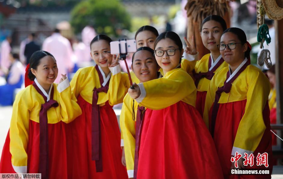 韩国举办传统成年礼 美少女穿韩服忙自拍(组图)