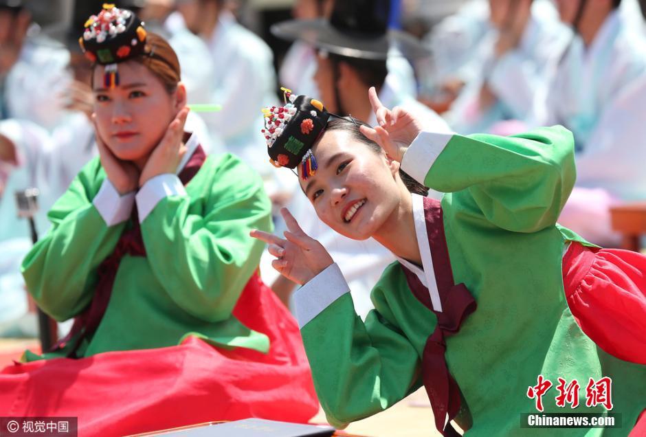 韩国举办传统成年礼 美少女穿韩服忙自拍(组图)