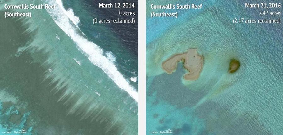 越南在南华礁非法填海造岛前后对比图。南华礁位于北纬8度45分,东经114度11分,六门礁东南约6海里。为一环礁,退潮时礁坪露出,中间有泻湖,礁湖水深约9米,有零星礁石隐没湖中。总面积34平方千米,其中礁坪面积22.3平方千米,中间礁湖面积11.7平方千米。