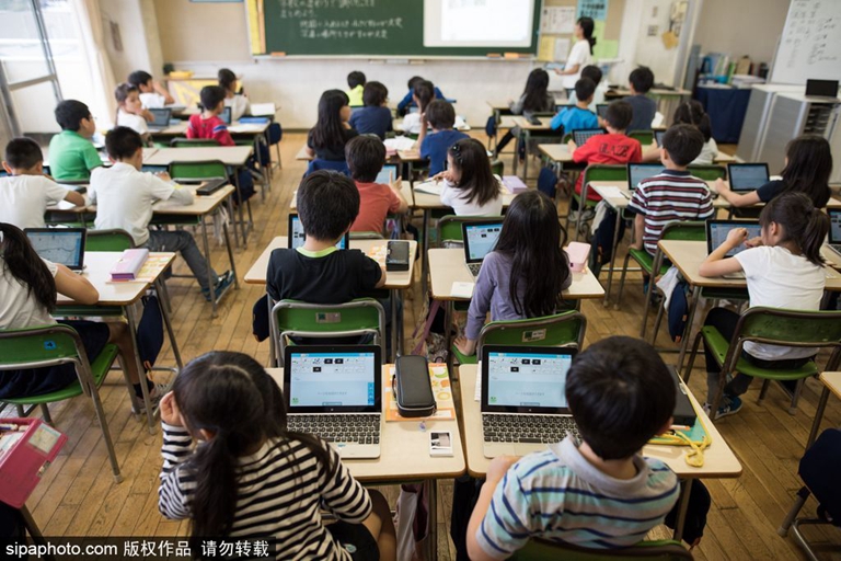 当地时间2016年5月17日,日本东京,Honmura小学的学生使用平板电脑代替教科书上课。(图片来源:Sipaphoto供稿)