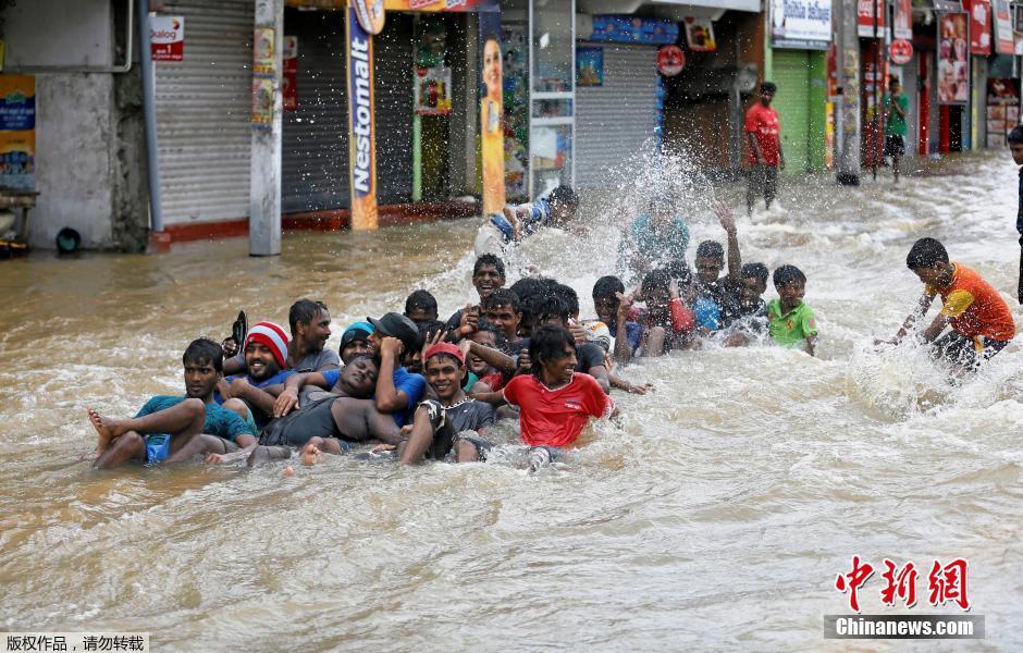 当地时间2016年5月17日,斯里兰卡,斯里兰卡遭遇暴雨引发洪水和滑坡,造成8人死亡,8人失踪,数千人被迫撤离。民众在水中嬉戏自拍。