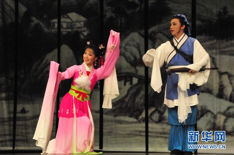 图为演出当晚,艺术家为观众演绎《天仙配》中的经典桥段。新华网记者张永兴摄