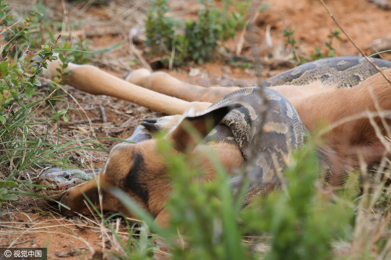 2016年4月,南非Marakele国家公园,一条饥饿的非洲岩蟒吞下一整只小黑斑羚,斑羚母亲只能在旁无助地看着。野生动物指导员Michelle Sole捕捉下了这惊人的一幕。barcroftmedia/视觉中国