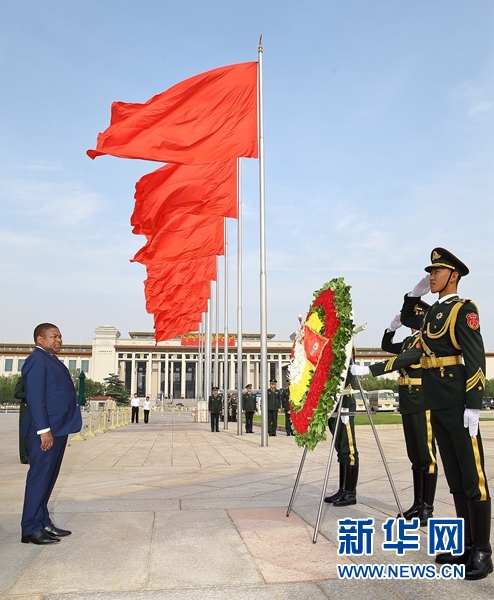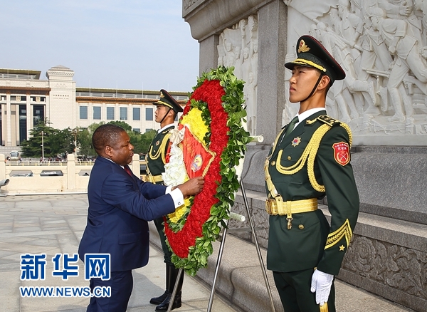 5月19日,莫桑比克总统纽西前往北京天安门广场,向人民英雄纪念碑敬献花圈。 新华社记者丁海涛 摄