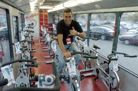 资料:2006年7月20日,一名展会工作人员在大巴车改建的流动“健身房”内介绍健身车的使用知识。当日,里约热内卢年度健身器械展开幕。这辆“大巴健身房”因其独特的创意受到广泛关注。新华社记者汪亚雄摄