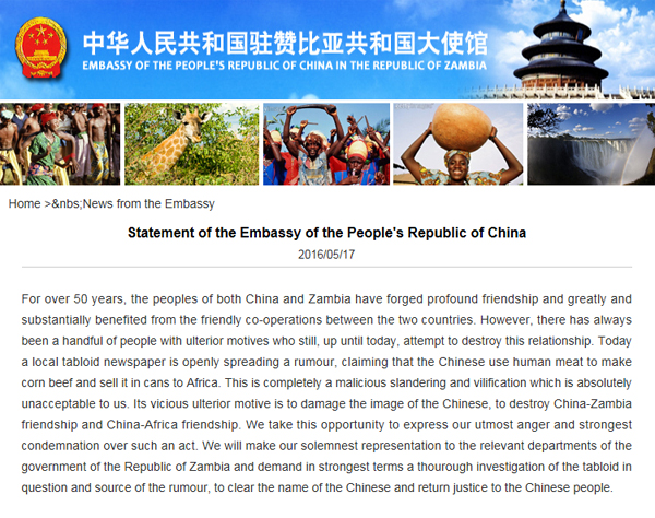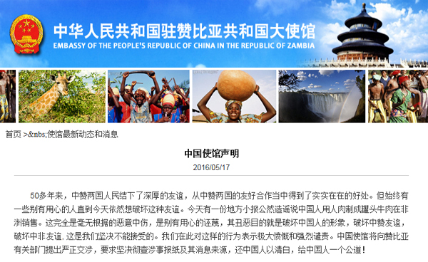 声明称,17日有一份赞比亚地方小报公然造谣说“中国人用人肉制成罐头牛肉在非洲销售”。这完全是毫无根据的恶意中伤,是别有用心的诬蔑,其丑恶目的就是破坏中国人的形象,破坏中赞友谊,破坏中非友谊,这是我们坚决不能接受的。