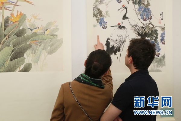 5月18日,在立陶宛首都维尔纽斯,观众在欣赏中国书画家的作品。当日,由北京市文史研究馆、北京市人民对外友好协会和立陶宛艺术家协会共同主办的中国传统书画展《桥》在立陶宛维尔纽斯孔塔泰艺术展览馆开幕。此次展览汇集了北京市文史研究馆和立陶宛竹园中国画学校的大量精湛作品。开幕式吸引了来自立陶宛政府、教育、艺术、传媒等各界人士。展览将持续至5月20日。新华网记者卜鹏摄