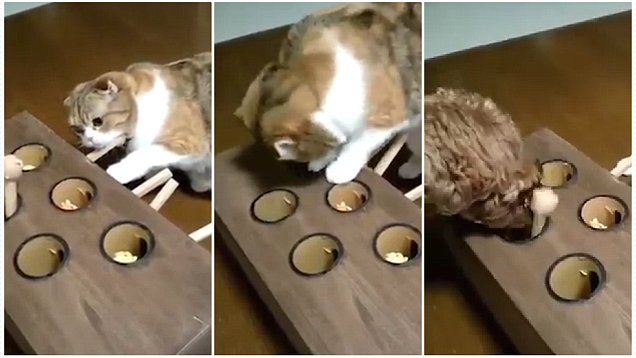 视频中,它先是将爪子放在一只控制杆上,看到玩具鼹鼠钻出洞后,它马上松开爪子扑了上去,那只玩具鼹鼠也就随之落回了洞中。反复几次后,它对控制杆越来越熟悉,动作也越来越迅速。不过尝试多次之后,依旧没能发现这个游戏的原理。