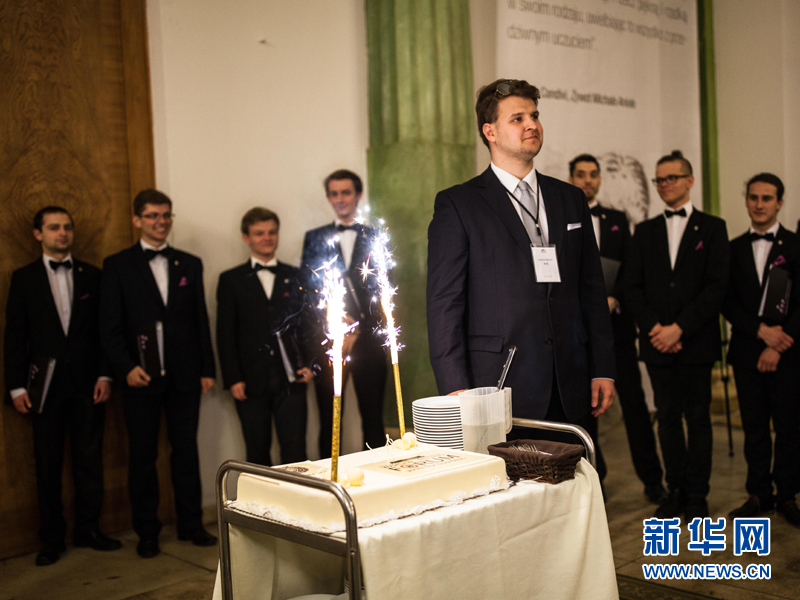主办方点燃插在蛋糕上的蜡烛,庆祝第三届华沙—北京大学生论坛在波兰顺利举行。新华网记者 陈序 摄