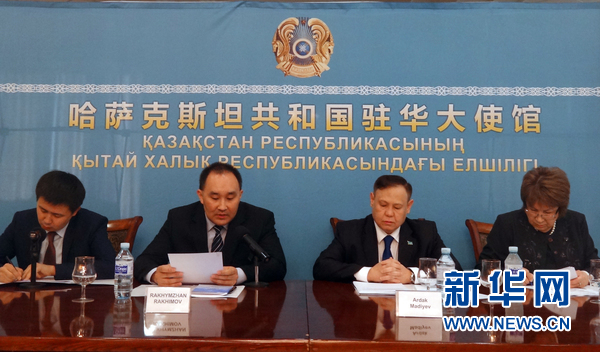 哈萨克斯坦驻华公使拉合莫夫(左二)在推介会上致辞。新华网记者黄河摄