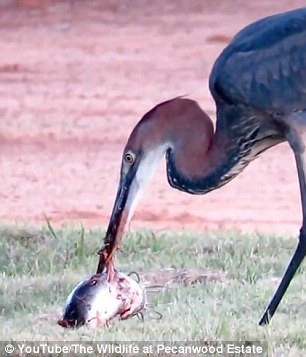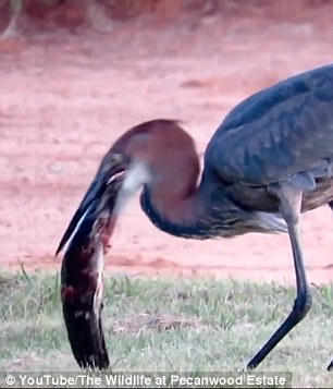 视频显示,这只巨鹭站在浅水滩中目不转睛地盯着水面,突然它猛地扎入水中,用喙刺起了一条硕大的鲶鱼并将其转移到陆地上。随后巨鹭试图用尖喙叼起鲶鱼并将其吞下,无奈鲶鱼体形过大且多次掉落。在几次尝试未果之后,巨鹭终于将鲶鱼活活吞入腹中,整个过程令人惊奇。