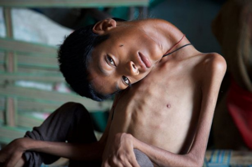 据外媒报道,印度13岁男童马亨德拉患有先天性肌肉病变,颈部因缺乏承托力,令头部倒转180度地垂着。