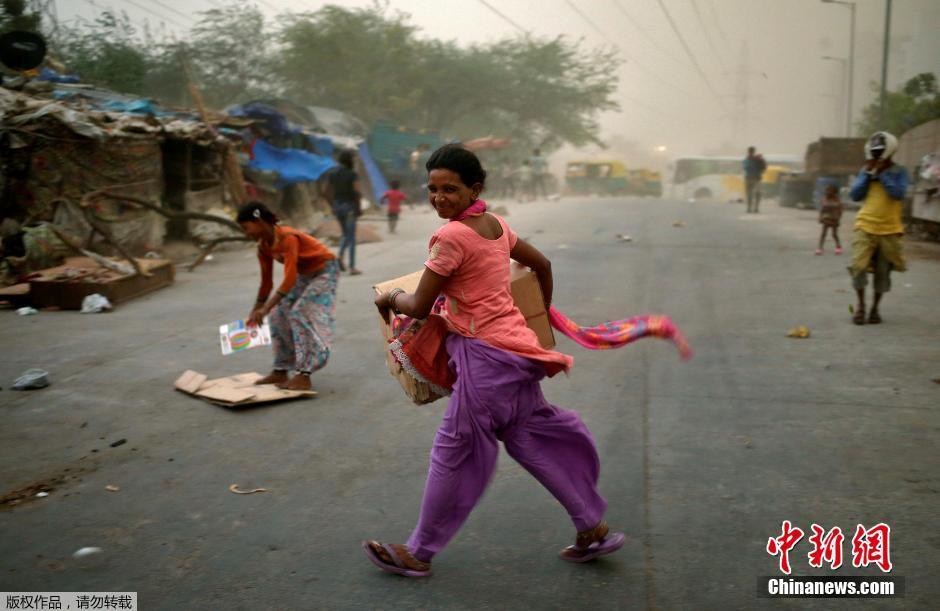 当地时间2016年5月23日,印度新德里,当地遭遇沙尘暴袭击,天空一片灰蒙蒙。大风夹杂沙土的侵袭给当地民众出行造成不便。