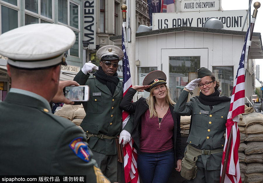 图为游客在前美军检查站拍照留念,这里曾是柏林墙的一个过境站。(图片来源:Sipaphoto)