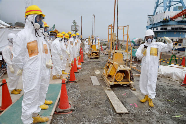 2013年8月6日,在日本福岛县大熊,当地官员和专家查看福岛第一核电站靠海一侧的护岸。日本政府原子能灾害对策本部2013年8月7日宣布,目前福岛第一核电站每天至少约有300吨污水流入海中。