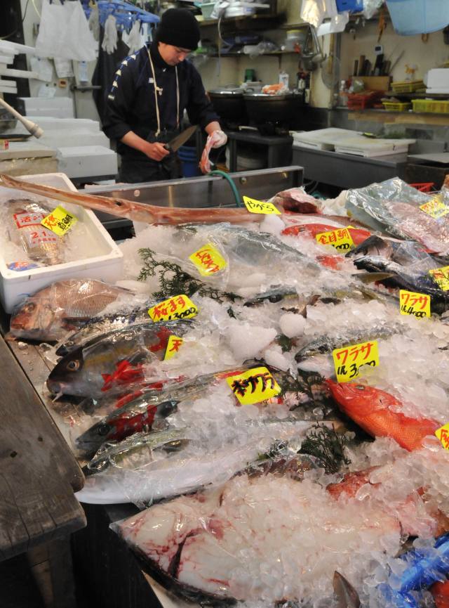 2011年4月5日,冷鲜鱼被摆放在日本首都东京一家海鲜摊上。新华社/法新