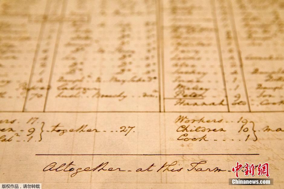 当地时间5月19日,美国弗吉尼亚佛瑞德·史密斯之乔治·华盛顿研究国家图书馆,华盛顿于1799年左右手写的弗农山庄奴隶名单。华盛顿故居弗农山庄之前主要陈列华盛顿生前所用家具和服饰,如今开始展示华盛顿作为奴隶主时期的物件。