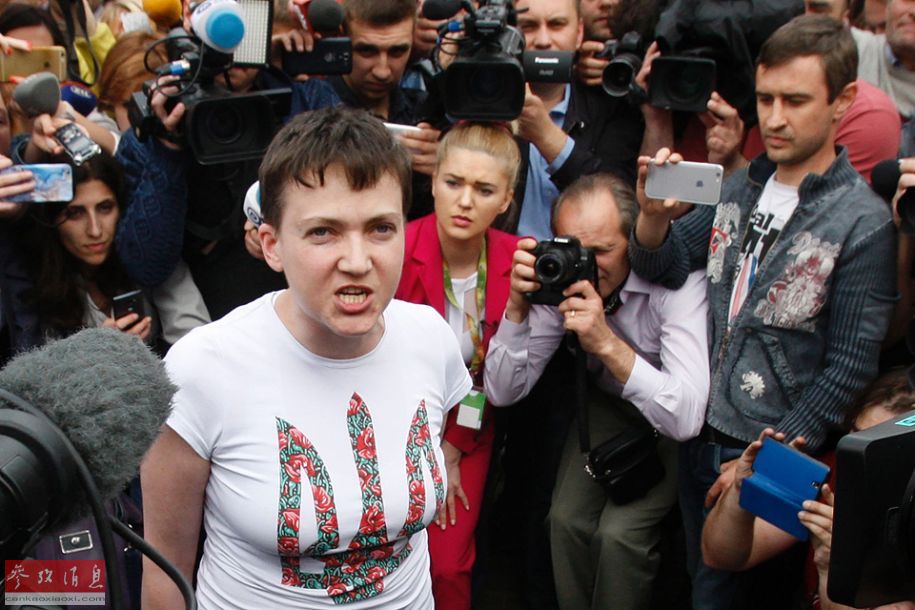 俄罗斯克里姆林宫网站5月25日公布了总统普京签署的关于特赦被俄方俘虏的乌克兰女飞行员萨夫琴科的命令。俄罗斯与乌克兰“换俘”一事就此尘埃落定。图为被俘乌克兰女飞行员娜杰日达·萨夫琴科(Nadia Savtchenko)被释放,抵达乌克兰基辅鲍里斯波尔机场。