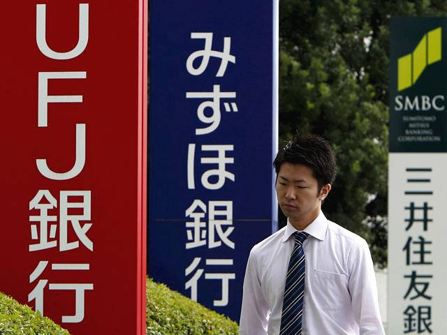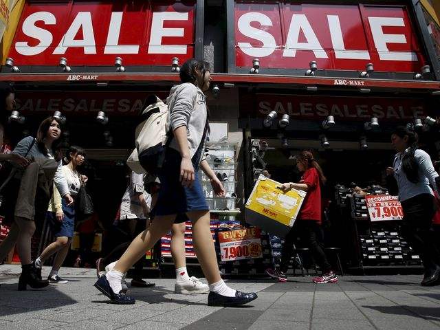 东京,行人从一家鞋店旁走过,店铺外高悬着打折告示。