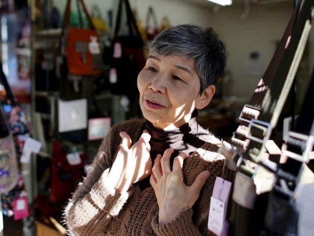 图中的她,71岁,在东京商业街经营着一家手包店。