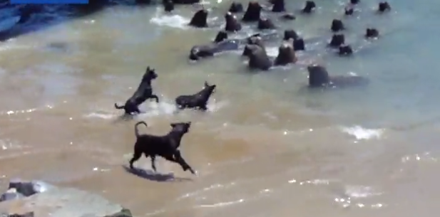 视频中的场景是不知名的一处海滩,一群海狮处于水中,四只黑狗站在岸边。黑狗因为惧怕海浪而频频后退,海水退去又继续冲上前对着海狮狂吠。海狮始终聚在一起,整体保持着高冷淡定的姿态,其中有一头海狮看起来像是领导者,在黑狗冲上来时总是挡在海狮群的最前面。