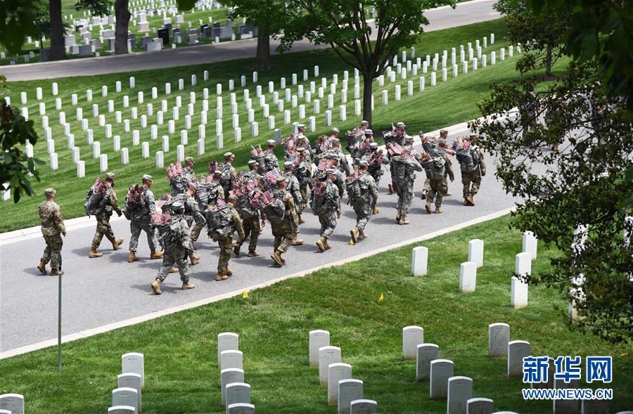 5月26日,在美国弗吉尼亚州的阿灵顿国家公墓,士兵们准备为墓碑插上国旗。每年5月的最后一个星期一是美国阵亡将士纪念日,为迎接纪念日的到来,1000多名美军士兵为阿灵顿国家公墓的22.3万多块墓碑前插上美国国旗。新华社记者 殷博古 摄