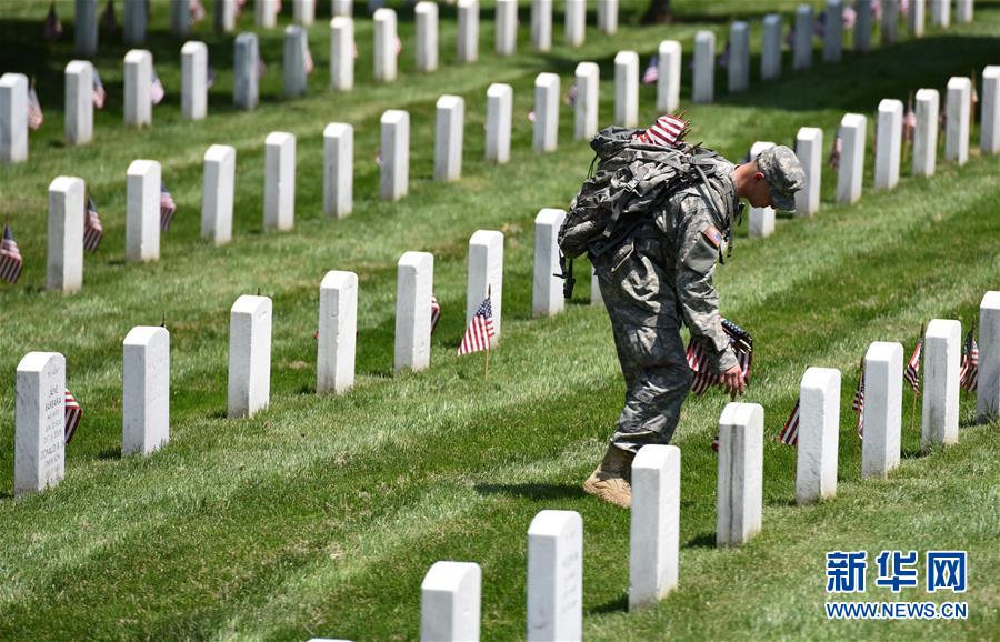 5月26日,在美国弗吉尼亚州的阿灵顿国家公墓,士兵在墓碑前插上国旗。每年5月的最后一个星期一是美国阵亡将士纪念日,为迎接纪念日的到来,1000多名美军士兵为阿灵顿国家公墓的22.3万多块墓碑前插上美国国旗。新华社记者 殷博古 摄
