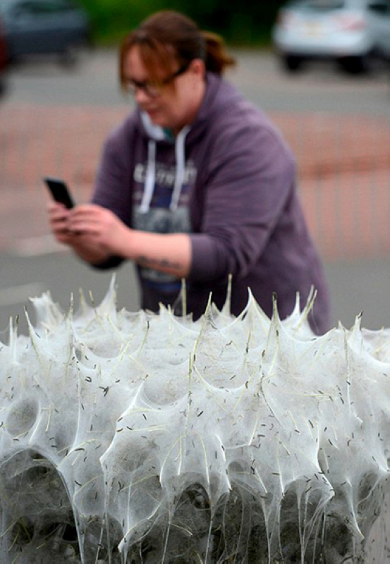 震撼!英国毛毛虫路边灌木丛上织巨网(图)