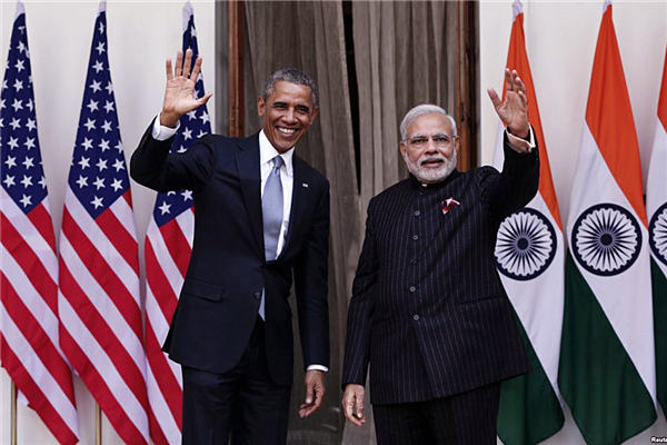 2015年1月26日,奥巴马访问印度。印度总理莫迪打破常规,在新德里机场以拥抱表达对奥巴马的热烈欢迎。