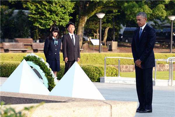 5月27日,在日本广岛和平纪念公园原爆死难者慰灵碑前,美国总统奥巴马默哀。当日,美国总统奥巴马在日本首相安倍晋三陪同下,访问了位于广岛的原爆遗址。