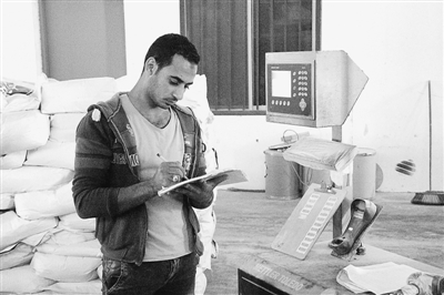 新希望公司埃及员工穆罕默德正认真地利用精密仪器进行饲料原材料的配比。本报记者 王云松摄