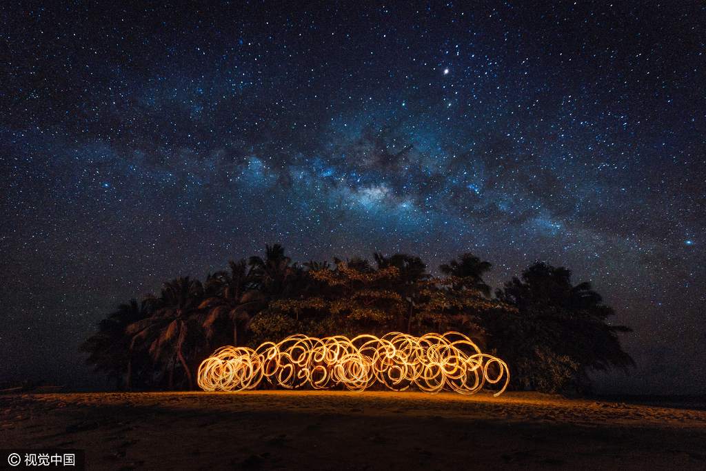 2016年5月29日消息,菲律宾锡亚高岛,摄影师Matien Janssen拍摄的银河下的火舞。swns/视觉中国