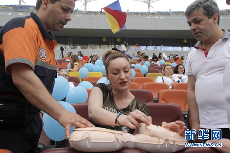 5月28日,在罗马尼亚首都布加勒斯特,医务工作者指导一年轻女士做练习。当日,罗马尼亚举行了该国规模最大的心肺复苏培训课,共有10175人参加了在国家体育场举行的培训课。 新华网发(佩特雷斯库摄)