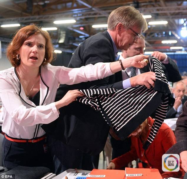 当时,左翼党主席正在为党代表大会作开幕致辞,一身红衣的瓦根内克特坐在会场第一排。一名年轻男子突然冲到她跟前,向她脸上狠狠扔了一大块棕色奶油蛋糕,嘴里还喊着什么口号。他马上被保安带走,没有反抗。