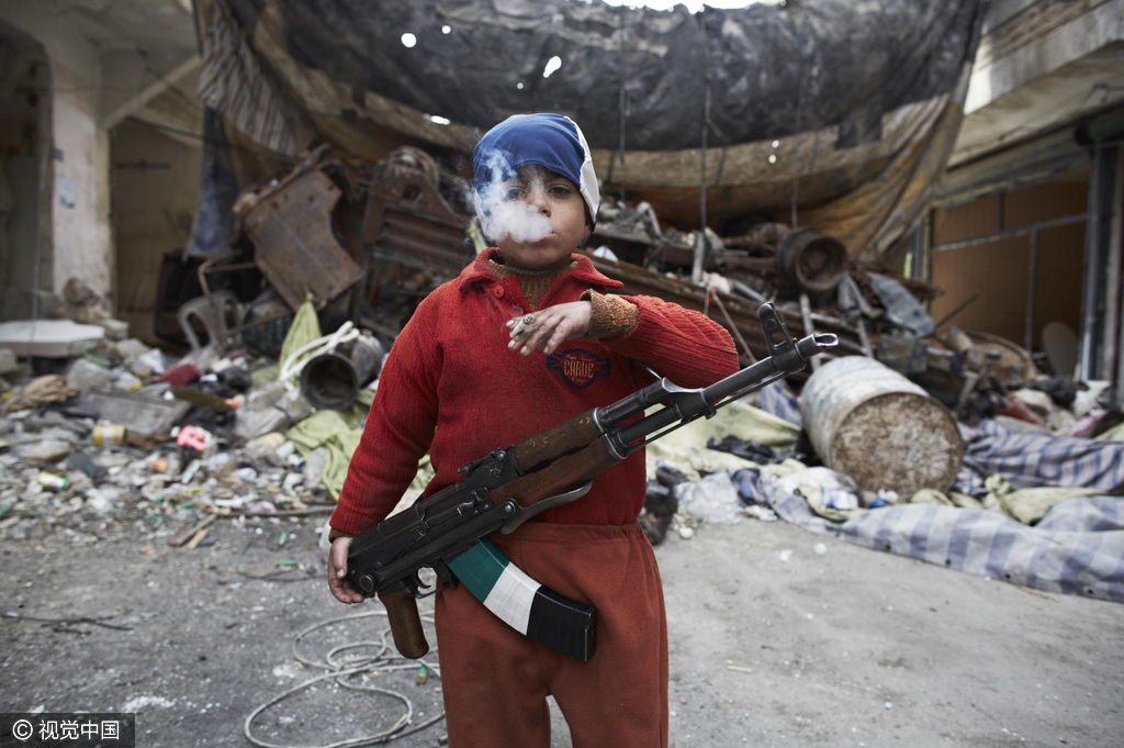 每年的5月31日为世界无烟日,也是中国的无烟日。吸烟已成为当今世界危害最严重的社会问题之一。图为当地时间2013年3月27日,叙利亚阿勒颇,一名叙利亚反对派武装“叙利亚自由军”(FSA)士兵的7岁儿子背着枪站在路障前抽烟。