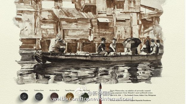 这种颜料为何如此特别?原来它们都是取自菲律宾首都大马尼拉地区受污染最严重的河水中。这一用污水颜料作画的“肮脏水彩”项目旨在用艺术唤醒菲律宾民众的环保意识。