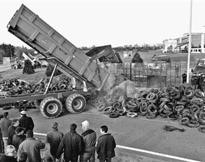 2016年3月23日,在法国西北部的拉瓦尔,奶农在拉克塔利斯奶业公司工厂的入口处倾倒稻草、焚烧轮胎,抗议奶制品价格降低。 新华社发