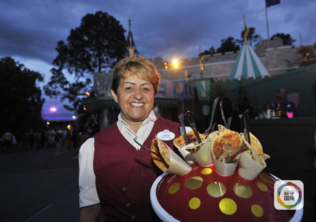 2010年5月16日,在美国佛罗里达州奥兰多的迪士尼乐园,一名工作人员为当年举办的美国国际旅游交易会的展商提供美食。新华社记者张军摄