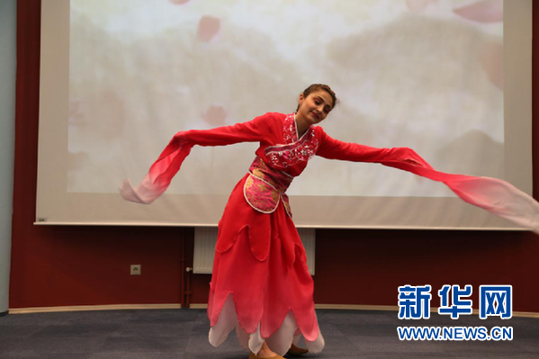 6月1日,在土耳其中东技术大学孔子学院主办的“诗词歌舞话端午”活动中,安卡拉大学汉学系学生艾卜卢•厄舍克表演中国舞。新华网记者施春摄