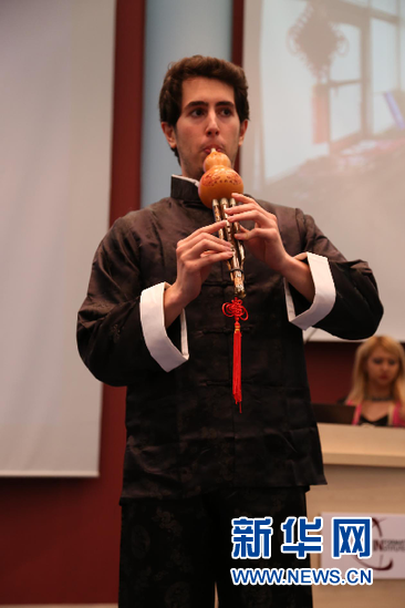 6月1日,在土耳其中东技术大学孔子学院主办的“诗词歌舞话端午”活动中,中东技术大学孔子学院学生穆特卢•艾杰用葫芦丝演奏《月光下的凤尾竹》。新华网记者施春摄